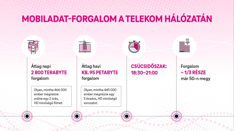 A hanghívási forgalom egy kétpúpú tevének a hátára hasonlít: a délelőtti 10-11 órás, valamint a délutáni 16-17 órás idősáv a csúcsidőszak, ráadásul a hanghívások 90%-a ma már VoLTE-típusú, vagyis adatalapú. A mobiladatforgalom is kulcsfontosságú, a hálózaton havonta 95 Petabyte adat közlekedik, aminek az 1/3-a már kizárólag 5G-n. Itt is van csúcsidőszak, ami a délutáni, esti órákban, 18:30-21:00 között található.