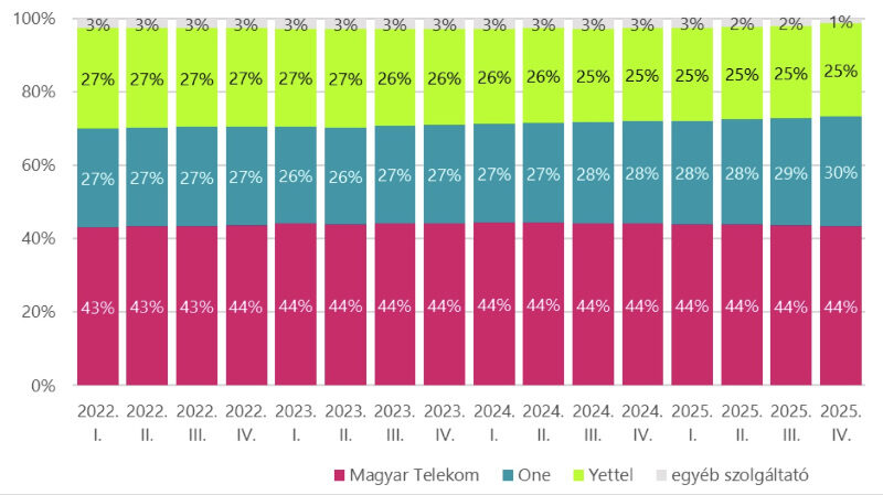 Az internetet forgalmazó előfizetések száma alapján számított piaci részesedések esetében már jóval korábban, 2023 második felében helyet cserélt a Yettel és a One (akkor még Vodafone), a két cég pedig mostanra 5 százalékponton kívülre került egymástól – miközben a Telekom ebben a szegmensben is sziklaszilárdan tartja az első helyet.